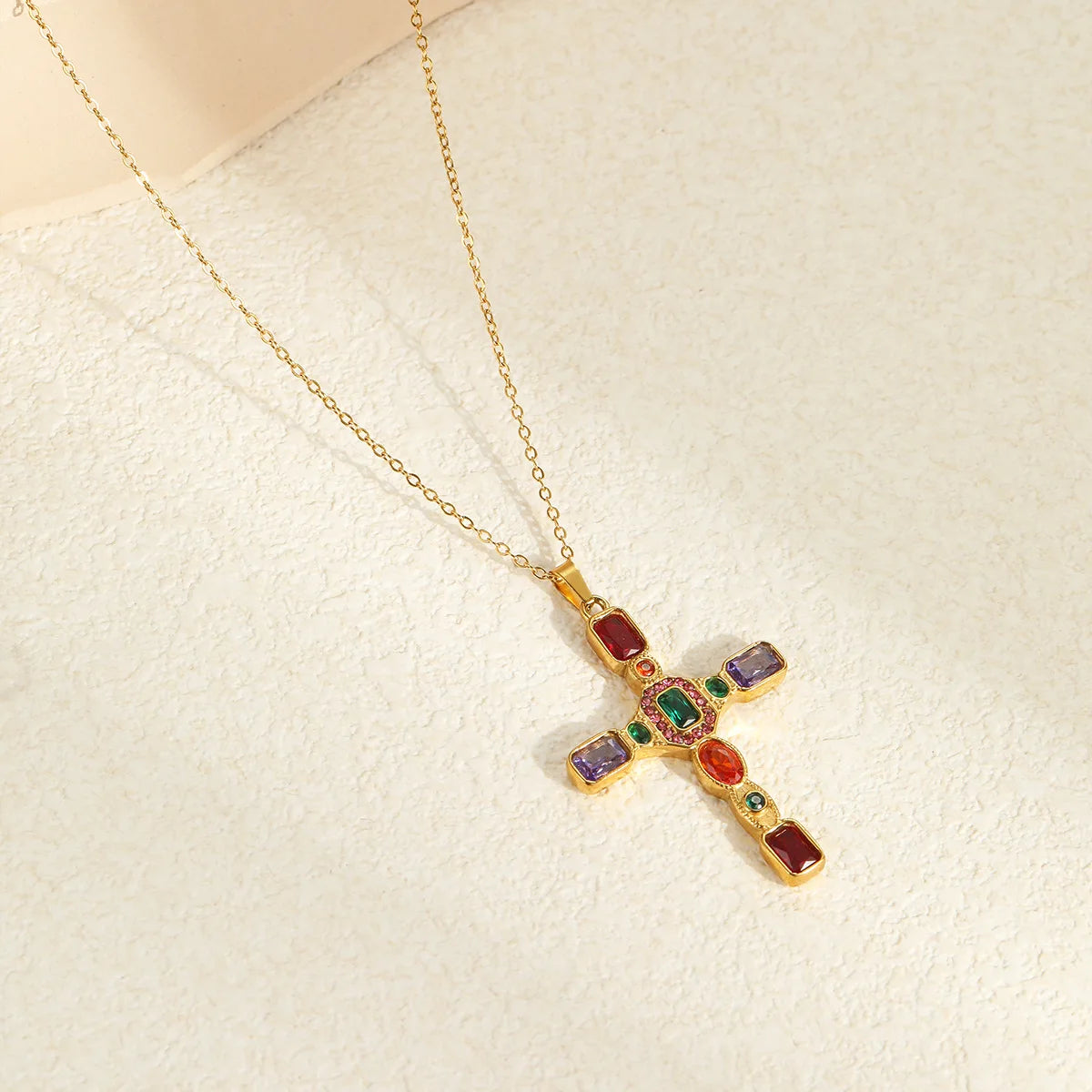 Discover the elegant "Garden at Giverny Cross” necklace, crafted with 18K gold plating and decorated with colourful Cubic Zirconia, symbolising a life full of abundance, faith, and spirituality. The length is 40.5 cm, with a pendant measuring 4.3 cm by 3.1 cm. The necklace weighs 8.3 g. Inspired by Claude Monet's 1900 painting, The Artist’s Garden at Giverny, which depicts vibrant flowers in full bloom, the necklace captures the lively spirit of the garden. Monet was 60 when he created this artwork, featuring diagonally arranged, brightly coloured irises that seem to sway in the breeze. The garden remains open today, welcoming thousands of visitors each year.
